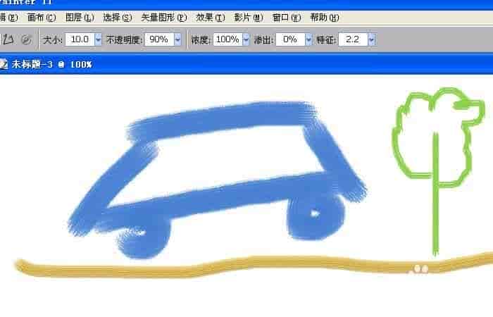 2、接着,设置画笔的颜色为蓝色,画笔的大小为20,并用画笔在画布上绘制一个简单的小轿车出来,如下图所示。