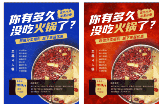 这两幅海报相比,右边红色的背景让人更有食欲,也很容易让人联想到火锅的热辣氛围。