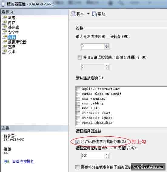 在弹出的“服务器属性”对话框中选中“连接”,勾选“允许远程连接到此服务器(A)”