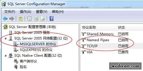 3、打开SQL服务器的TCP/IP是允许的,在开始菜单中找到Microsoft SQL Server 2005——配置工具——SQL Server Configuration Manager,在该窗口中把SQL Server 2005网络配置下面的MSSQLSERVER的协议下面的TCP/IP和Named Pipes都启用。