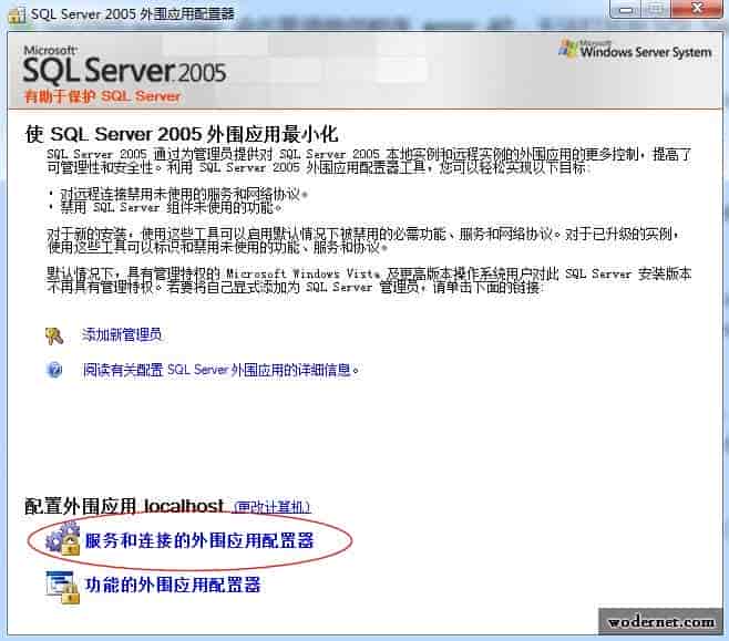 4、配置“SQL Server 外围应用配置器”是允许进行远程连接的,在开始菜单找到Microsoft SQL Server 2005——配置工具——SQL Server 外围应用配置器并打开,