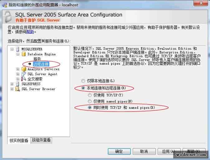 在“服务和连接的外围应用配置器”对话框中,依次点击:MSSQLSERVER——Database Engine——远程连接,在右边选中“本地连接和远程连接”和下面的同时使用TCP/IP和named piese。