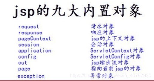 jsp中的内置对象,是指 Tomcat在翻译jsp页面成为 Servlet源代码后,内部提供的九大对象,叫内置对象,内置的意思就是本身就有,我们可以直接用。
