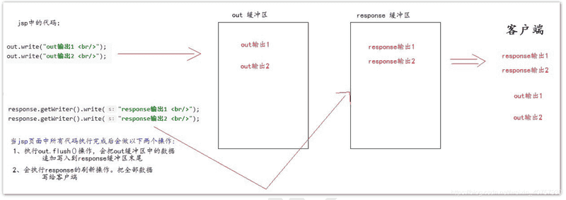 不管out语句在response语句的上面还是下面,输出时总是response语句的内容在上面,因为在向客户端输出时,out缓冲区中的内容会追加到response缓冲区中,统一输出。