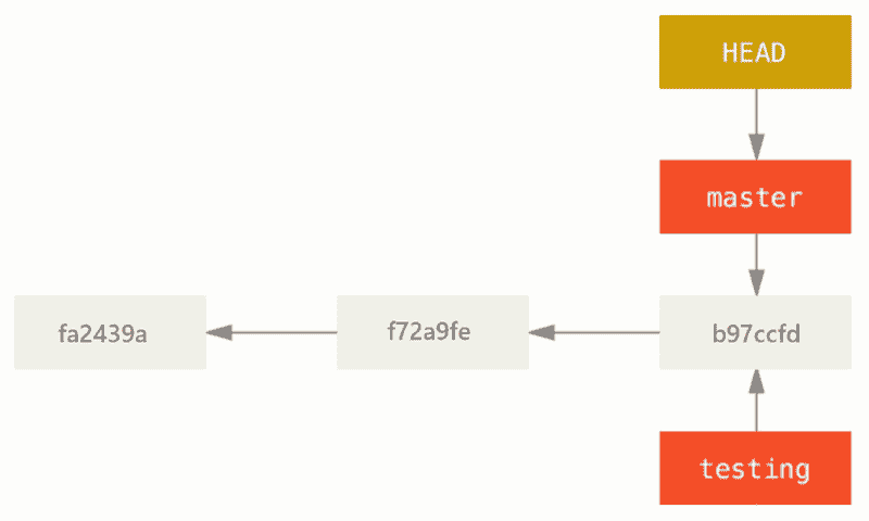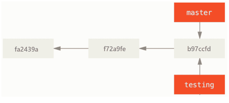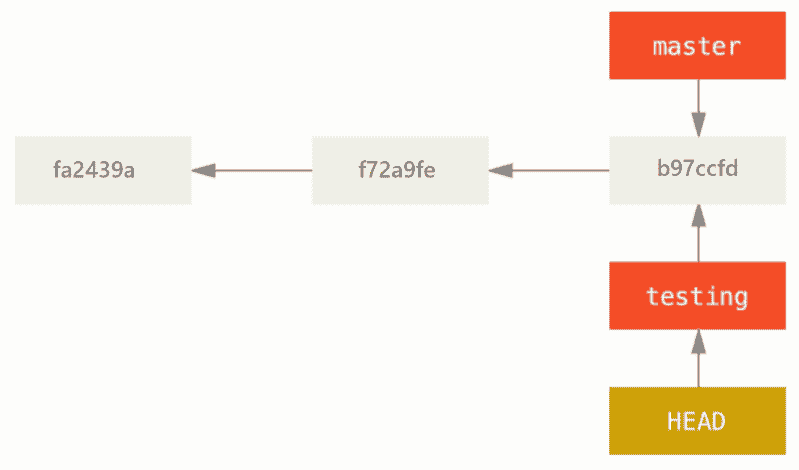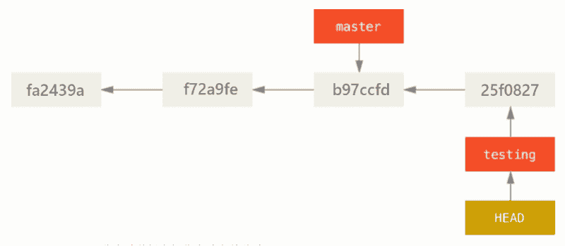 如图所示,当前 master 和 testing 分支均指向校验和以 b97ccfd 开头的提交对象。
