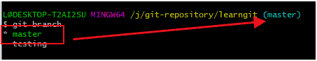 L@DESKTOP-T2AI2SU MINGW64 /j/git-repository/learngit (testing) $ git checkout master Switched to branch 'master' L@DESKTOP-T2AI2SU MINGW64 /j/git-repository/learngit (master) $ git branch * master testing
